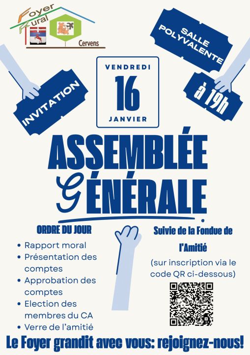 Le Foyer Rural organise son Assemblée Générale annuelle vendredi 16 janvier 2026 à 19h.