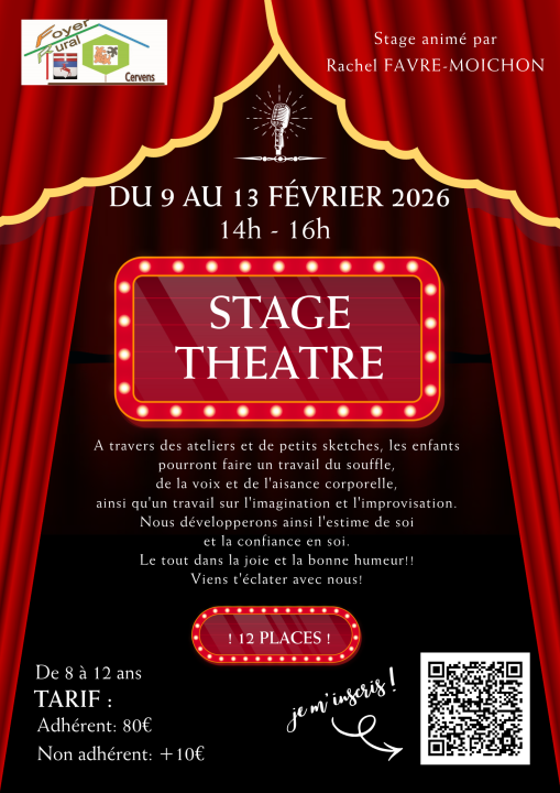 Le Foyer Rural a le plaisir de proposer pour la 1ère fois à vos enfants un stage de théâtre pendant les prochaines vacances scolaires, animé par Rachel FAVRE-MOICHON qui conduit avec sa comparse Sandra l’activité Comédie Musicale depuis septembre.