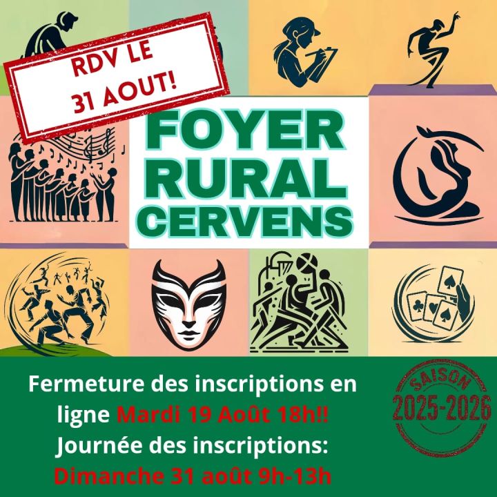 Nous serons ravis de vous accueillir en personne lors de la journée des inscriptions le dimanche 31 août de 9h à 13h à la salle polyvalente de Cervens.
